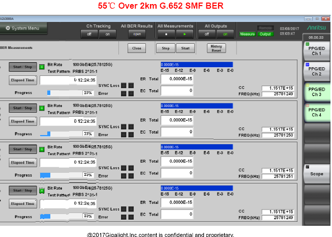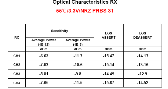 Gigalight’s QSFP28 PSM4 exhibits excellent performance under the three-temperature (-5 °C / 25 °C / 55 °C) environment, and both of the uniformity and consistency of the four-channel could meet the design specifications. All thee margins under the conditions of three-temperature are over 15% while the sensitivity is superior to -9.5dbm(1E-5) that required by the agreement.